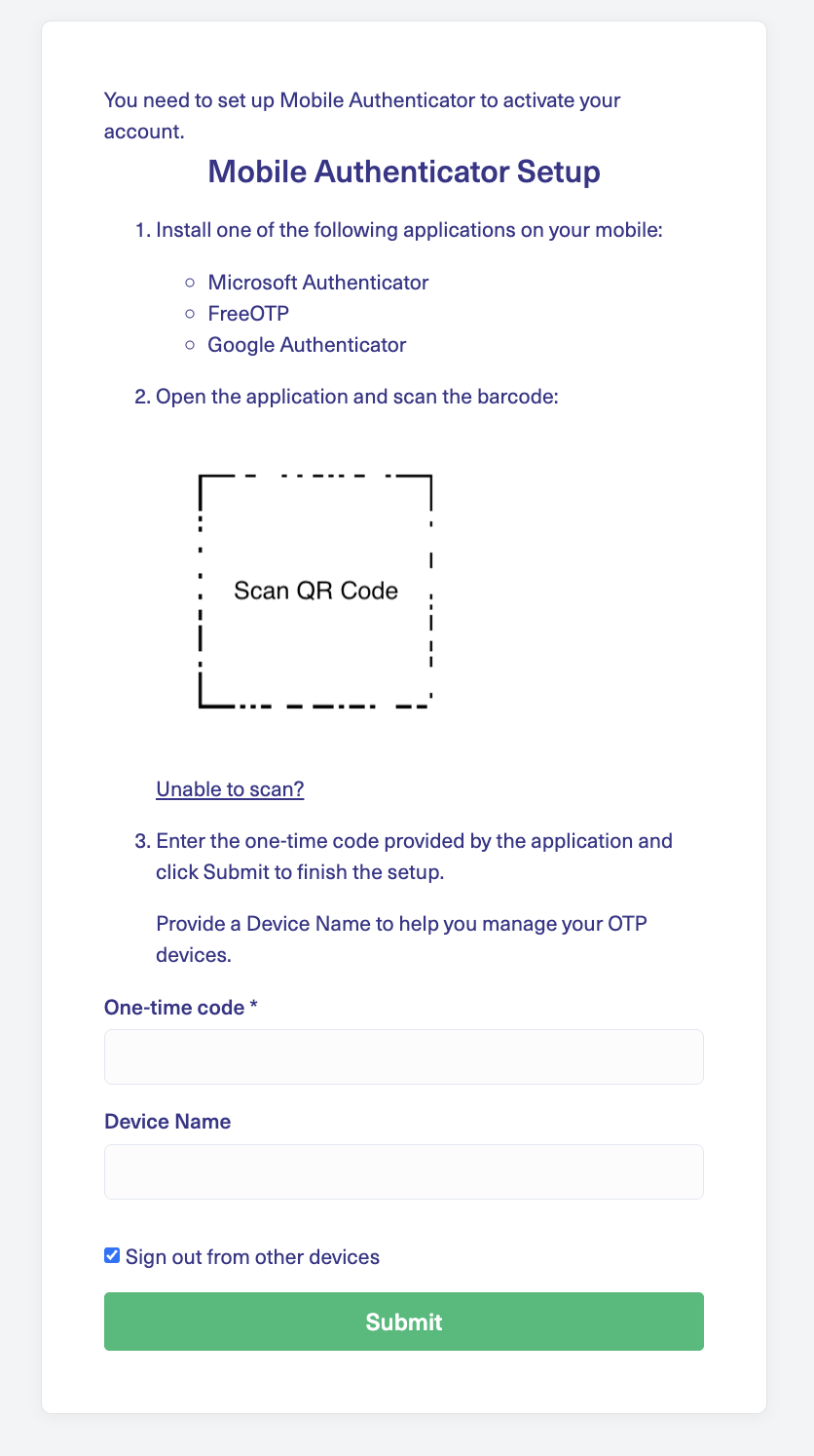 - Follow the instructions to configure OTP using your mobile authenticator app