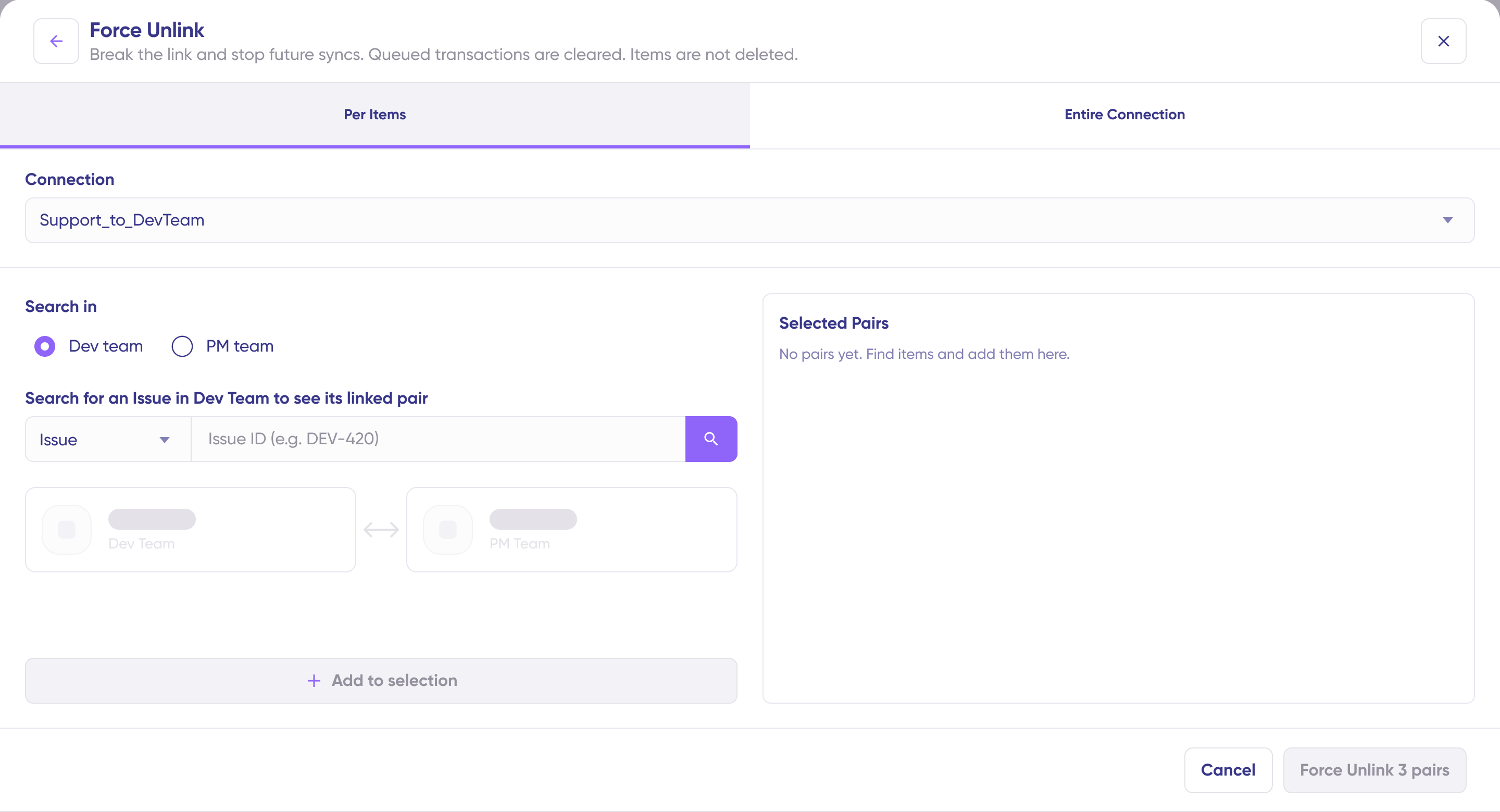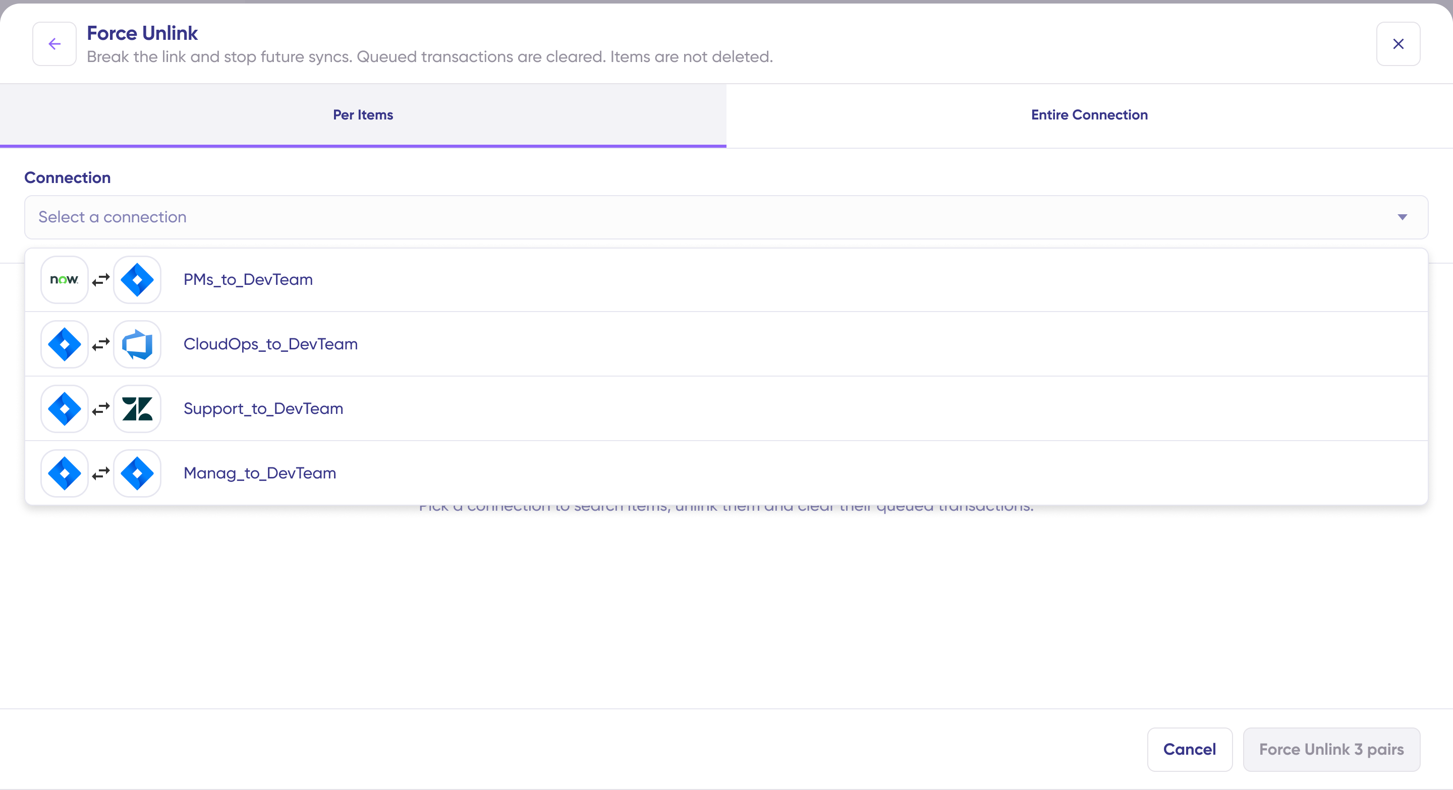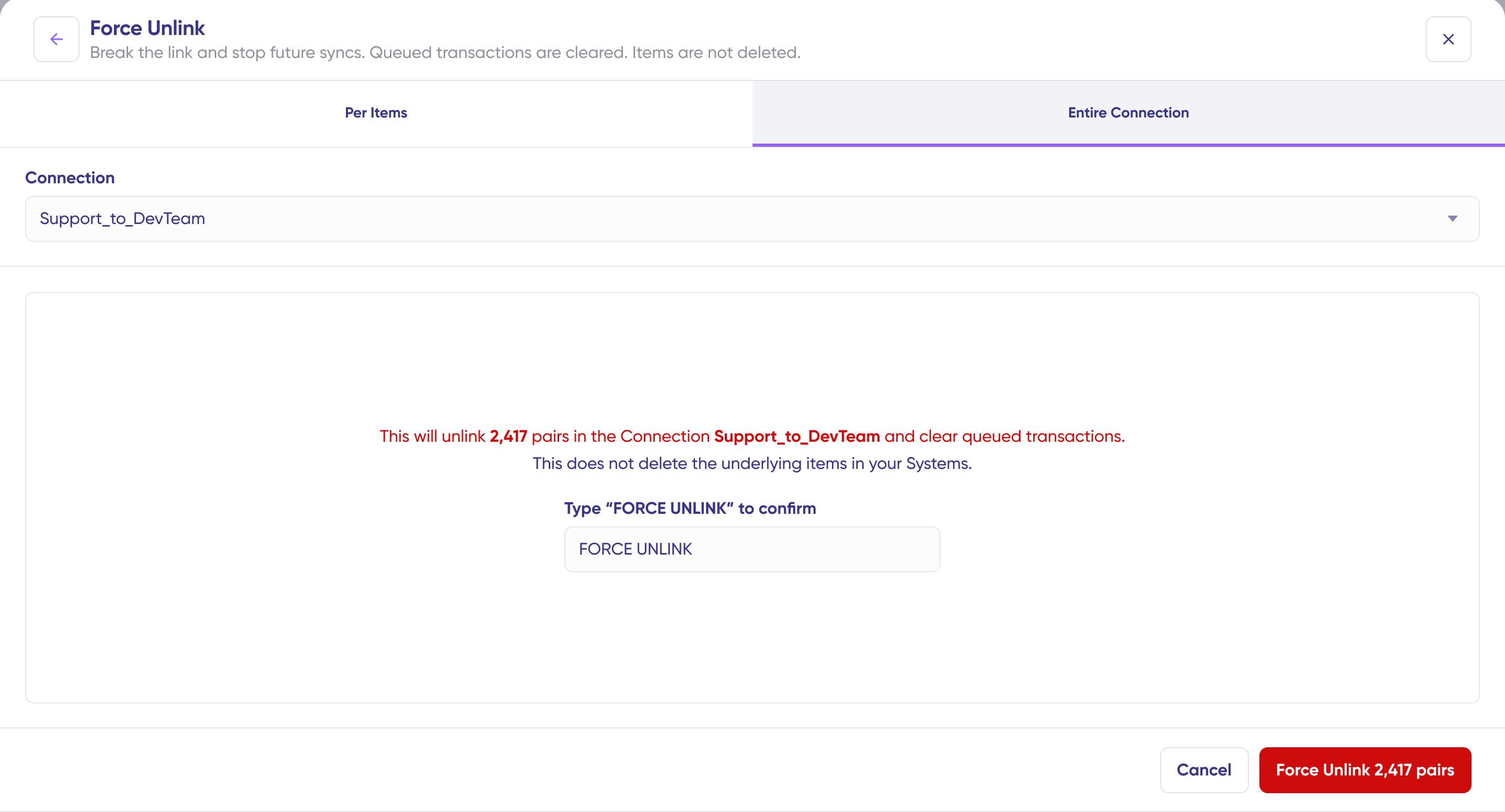 Result: All item pairs in the selected connection will be unlinked and their queued transactions cleared. The items remain in your systems but will no longer sync with each other.