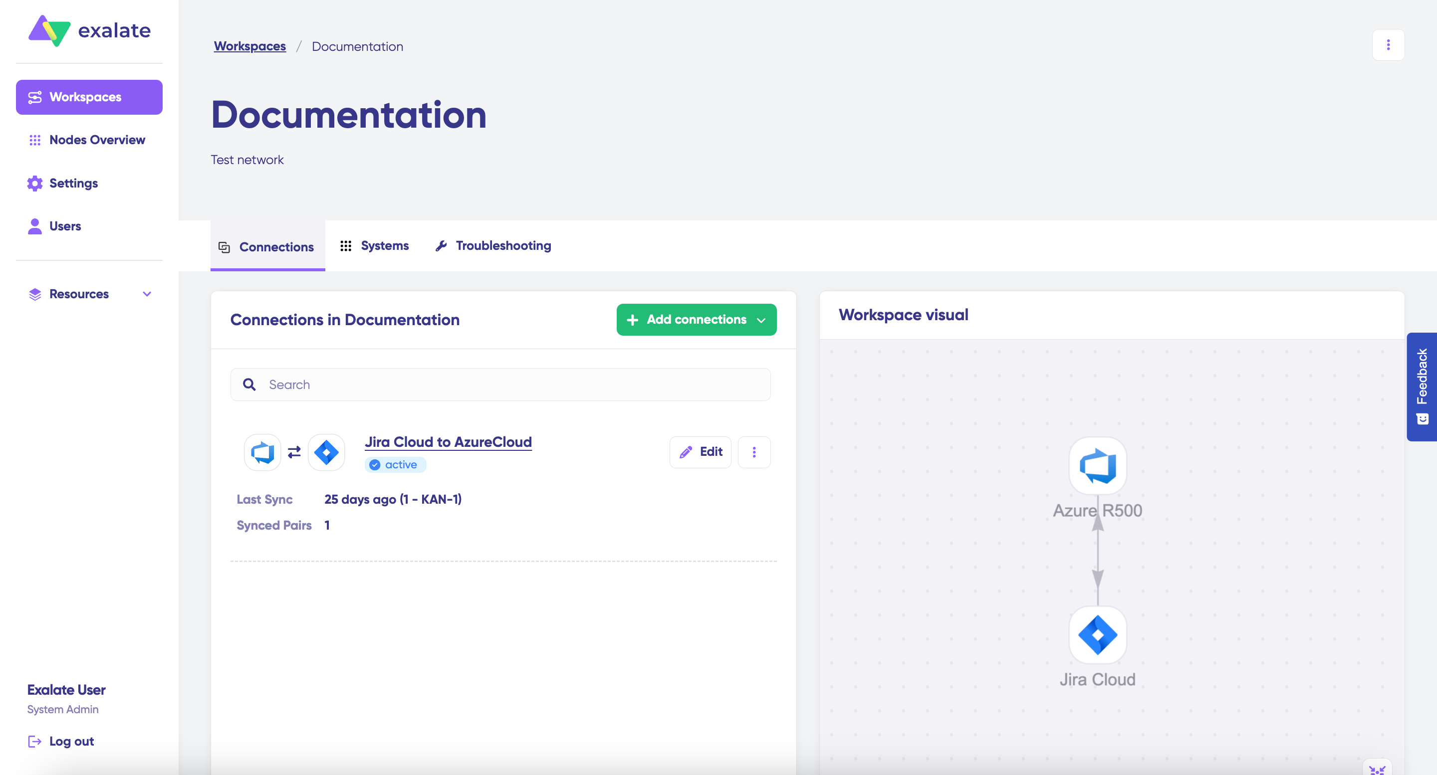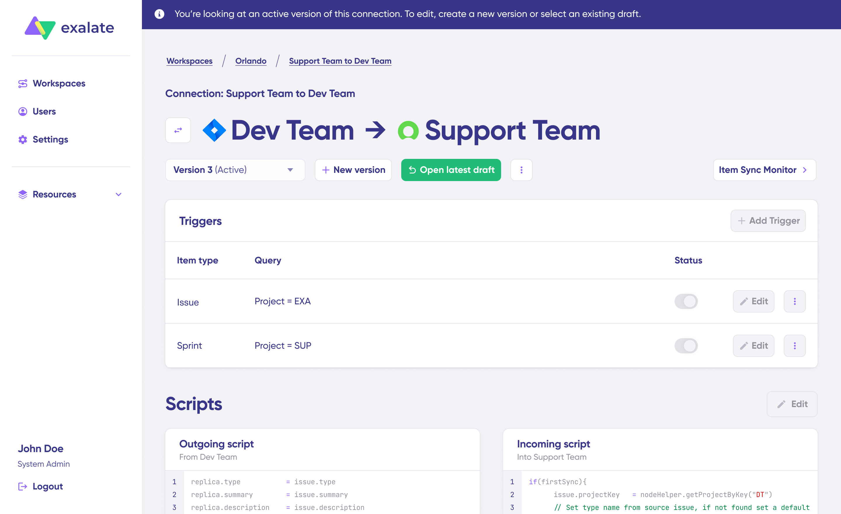 In New Exalate console, you can easily modify sync rules and manage how integrations are configured between your existing Exalate nodes. The interface allows you to work on both sides of the connection simultaneously, displaying the outgoing script from the source side and the incoming script from the destination side on a single screen.