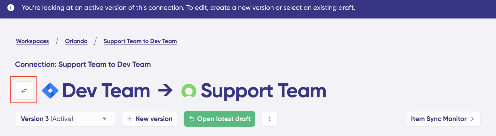 When editing a connection, remember that changes apply only to one direction at a time. To ensure a complete configuration, click the Switch Direction button to modify the sync rules for the opposite flow. This will create a new version (or draft) for that direction, which also needs to be reviewed and published.