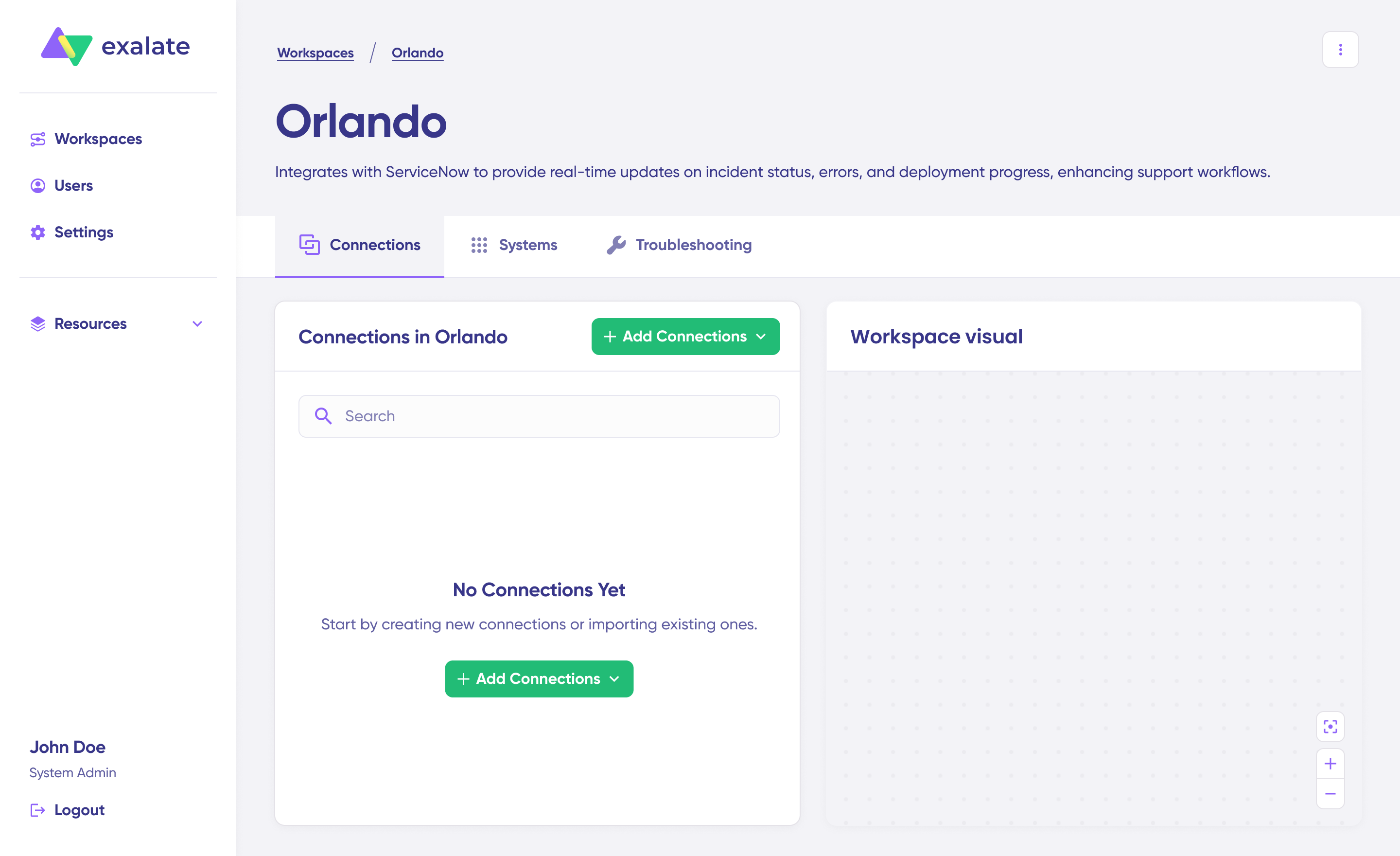 You can create one or more workspaces to organize and manage your Exalate nodes and connections efficiently. The same nodes can belong to multiple workspaces, but connections are restricted within a single workspace. A connection cannot exist in more than one workspace.