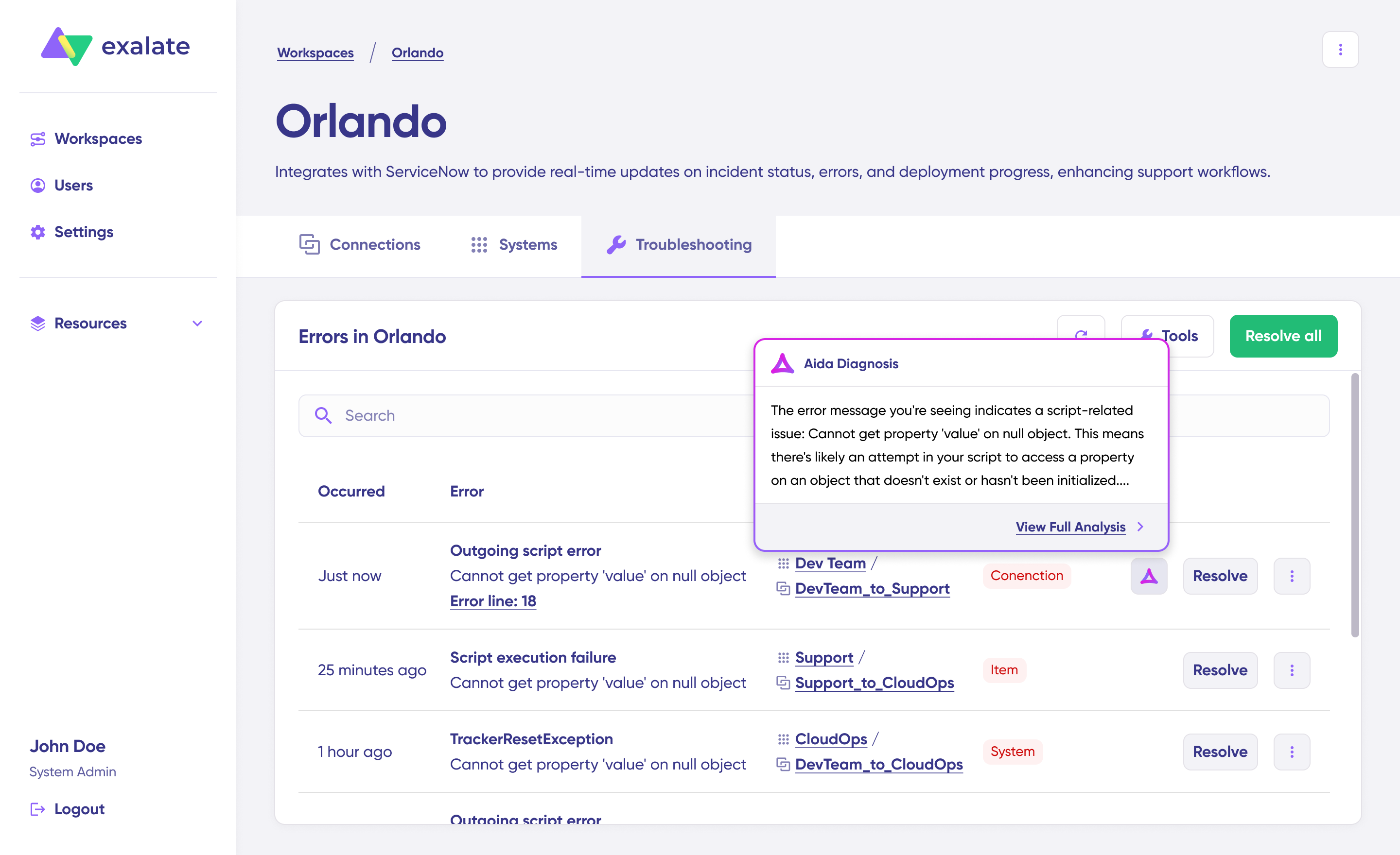 Get intelligent help writing sync scripts and resolving errors with AIDA, your AI assistant built into a new Exalate Console.