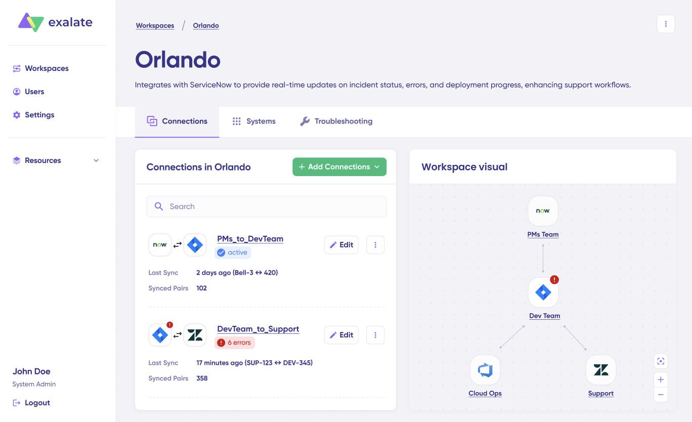 The New Exalate experience is the latest version of the platform that introduces a unified web-based console for managing all integrations in one place. Instead of separate consoles for each connected platform, you now access all connections, configurations, and monitoring through a single interface at exalate.app.