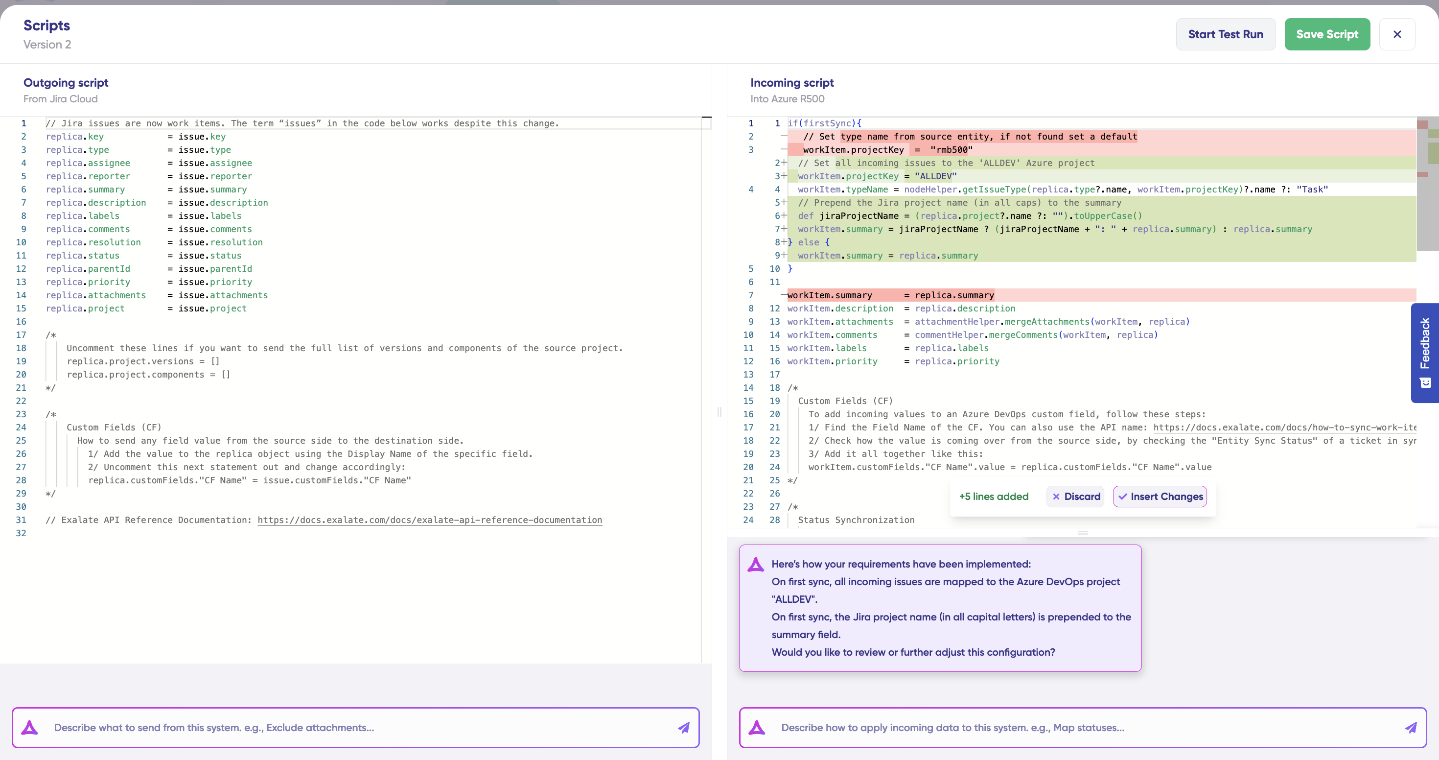 - For Outgoing scripts: Describe what data should leave your system. For example, "Exclude attachments" or "Only sync high-priority issues."